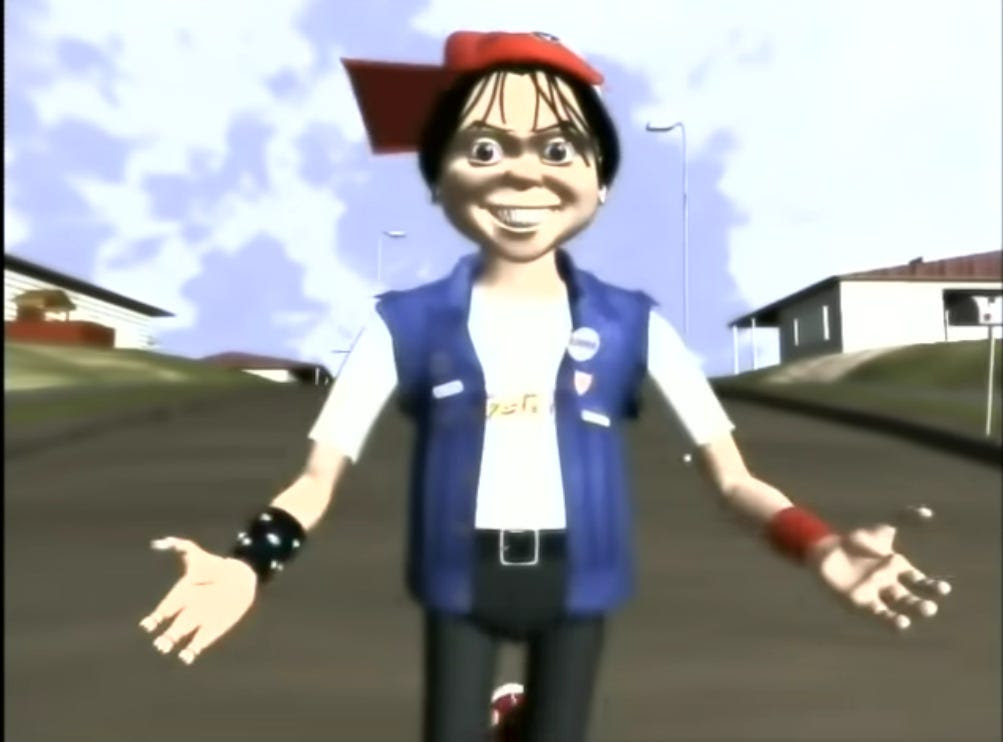 There are two discrete parts to the ‘Let’s Get Rocked’ video. One part is a fully computer-generated 3D cartoon, featuring an animated character named Flynn, who is loosely based on Bart Simpson.