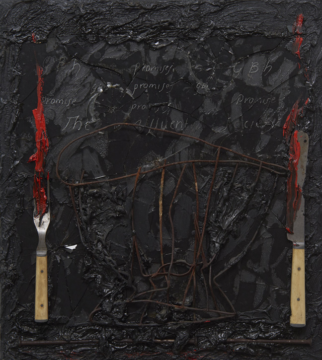 For people like Derek Jarman, this felt like being at war. His art from this period became furious and apocalyptic. There are pieces like Smashing Times, which shows a crucifix with a used condom and lube; shiny coins pressed into black paint in Dead Man’s Eyes; and the unambiguous Margaret Thatcher’s Lunch: