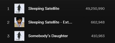 • AWOOSHs: Artists With One Outsized Signature Hit. It feels unfair to call these people one-hit wonders, because they often have a substantial catalogue with a smattering of modest hits. It’s just that one of their songs was massively more successful than the others. Tasmin Archer is a good example of an AWOOSH. You can see in her Spotify stats that her big hit absolutely eclipses everything else she’s done: